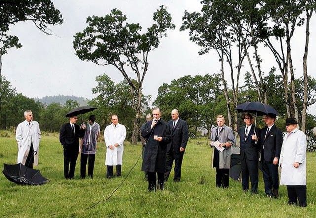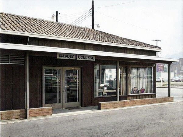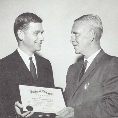 UCC was founded on March 30, 1964, when Harry Jacoby (right) received the Umpqua Community College charter from Governor Mark Hatfield (left) on election day when Douglas County voted overwhelmingly to have a community college established.