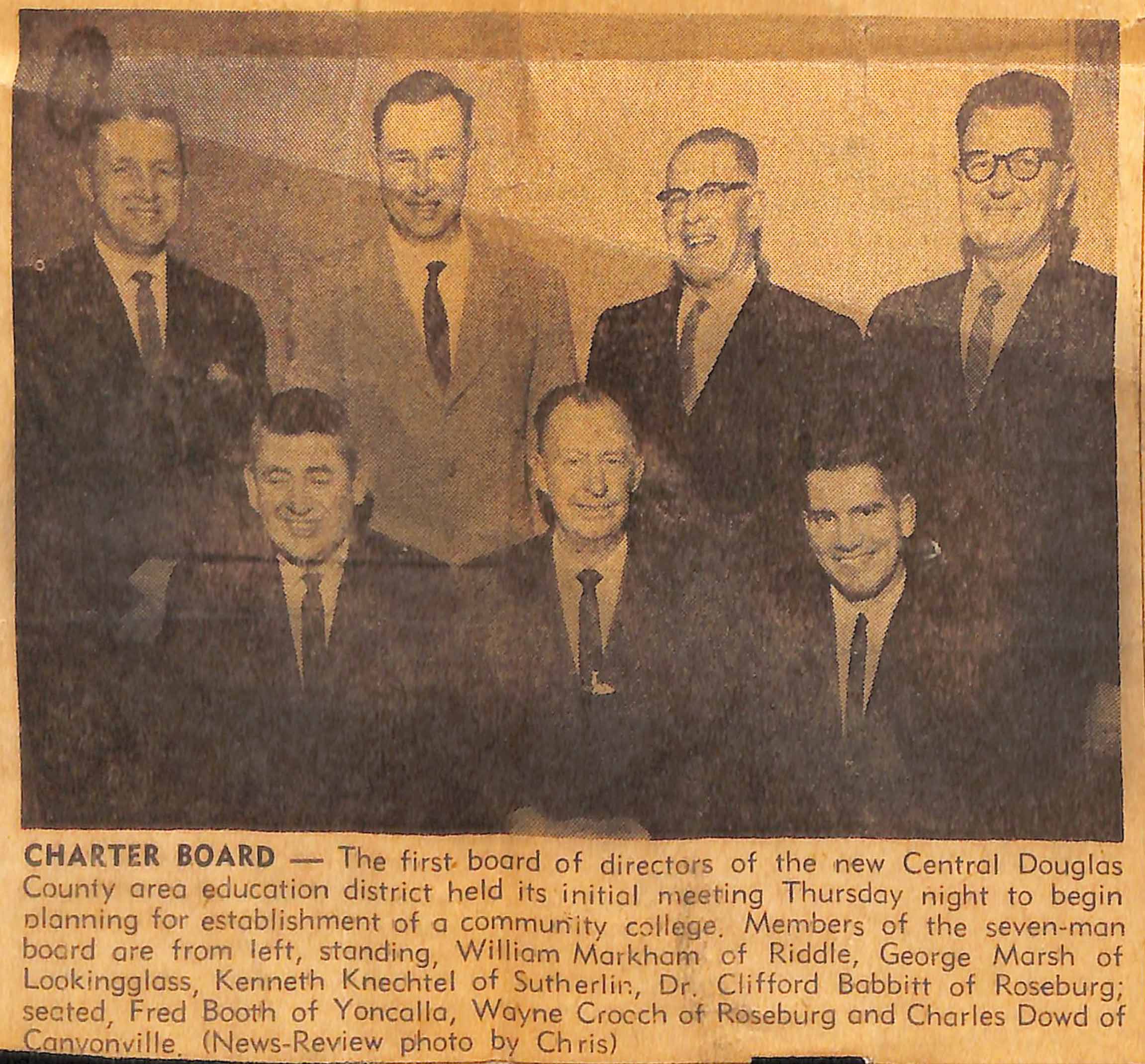 UCC’s first board of education. This image is taken from a News-Review story that covered the new installation of the elected board and their first meeting. The board members were elected in the same March 30 election.