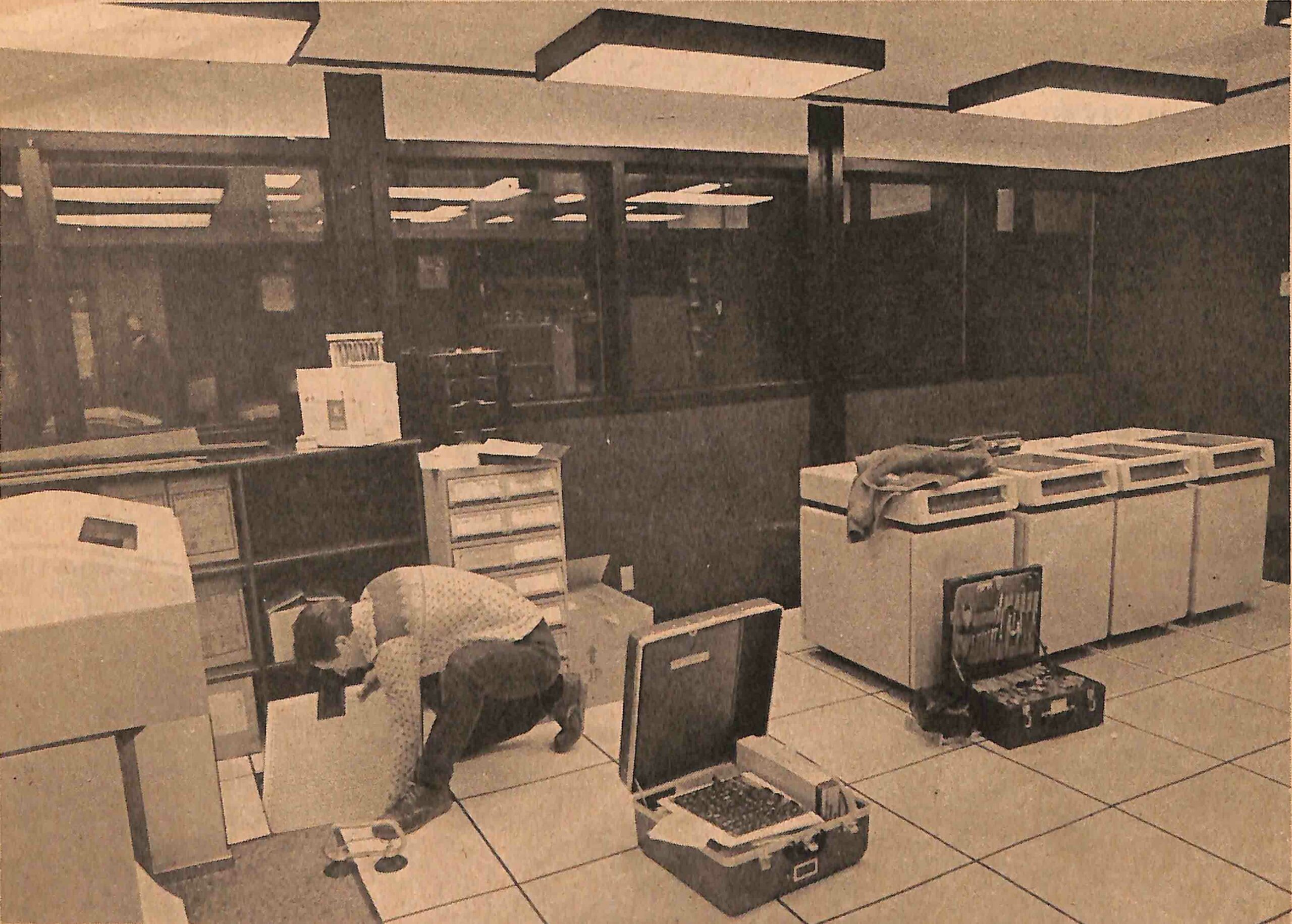 The clipping reads: George Roth, director of data processing at Umpqua Community College, is busy this week moving his operation into UCC’s new Educational Skills Building. Besides the data processing department, the $1.1 million structure will house UCC’s learning skills center and instructional materials center.