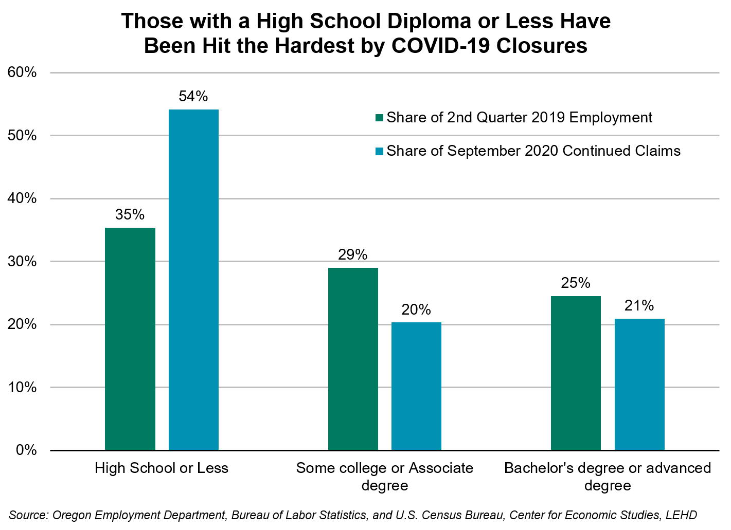 The answer to that question can be found in the recent data released by the Oregon Employment Department. According to the Employment Department, When comparing the level of education for recent unemployment insurance claimants compared with the educational attainment of the entire labor force, it’s clear that those with lower levels of education have been hit particularly hard.