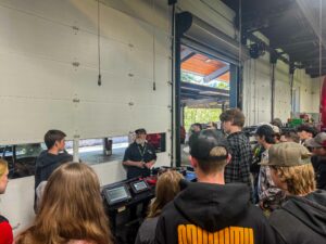 A Roseburg Forest Products truck driver, Rusty Brown, opened the hood of a heavy-haul flatbed truck to show students how to conduct a pre-trip inspection and get a glimpse of truck driving in the wood products industry. “It’s an honor to drive down the road in one of these. I get to be in charge of 100 feet of a vehicle behind me. It’s a sweet, serene job,” said Brown.