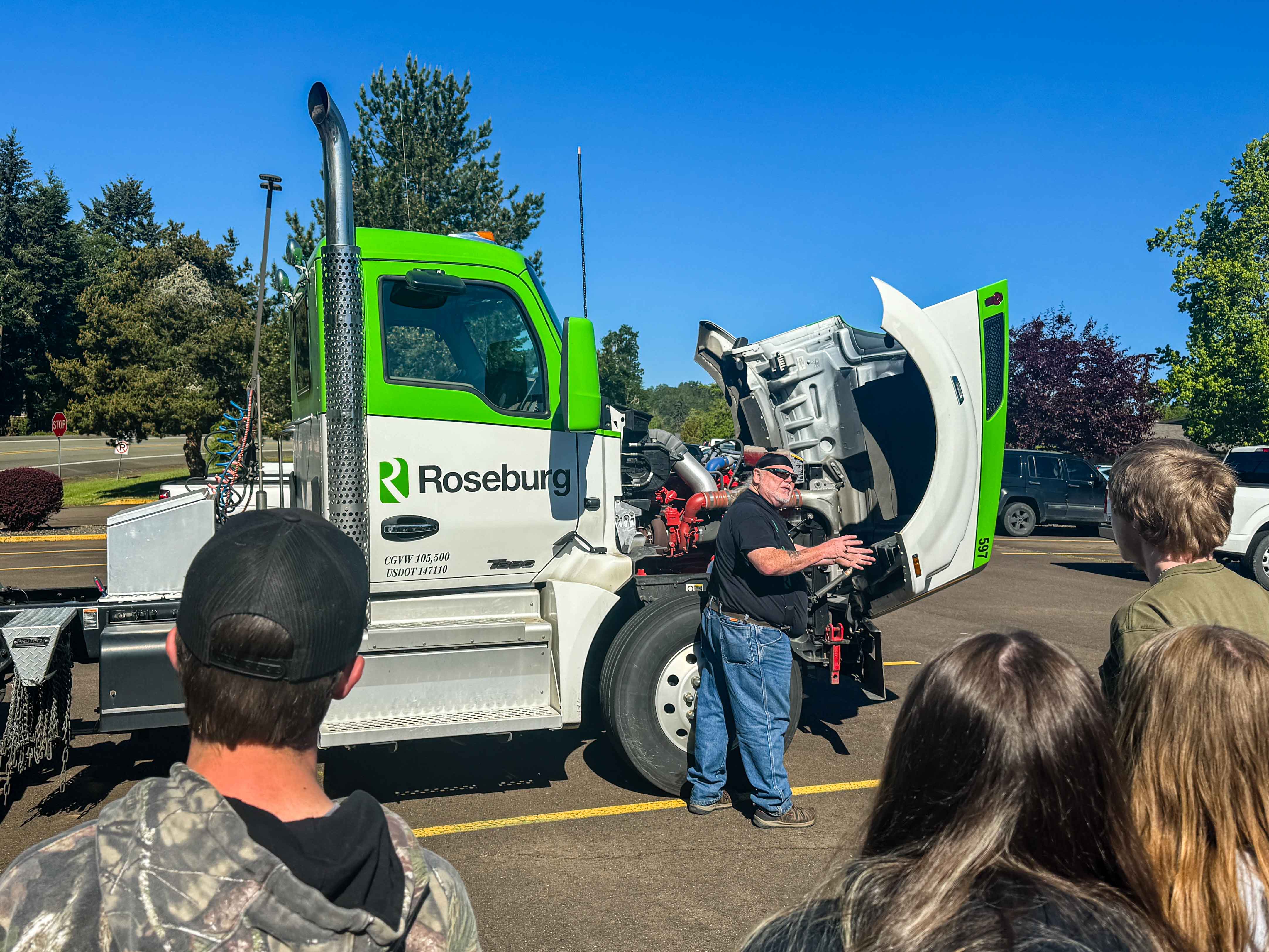 Roseburg Forest Products truck driver, Rusty Brown, opened the hood to show students how to conduct a pre-trip inspection.