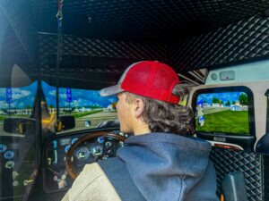 A truck simulator provides students with the chance to experience driving a semi-truck.